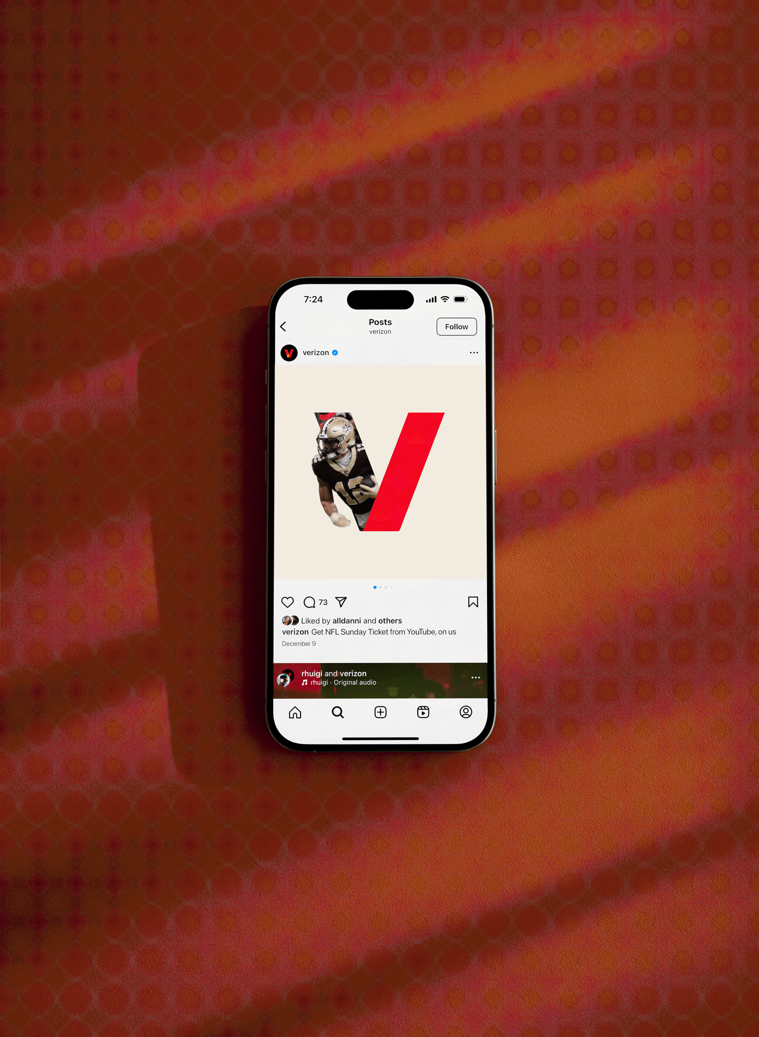 As a hero element, the Activated “V” served as a dynamic portal into the brand’s NFL partnership. Players emerge through the left stem of the letterform, while the right side is boldly filled in Verizon Red—establishing a visual constant that reinforces brand reliability and recognition.