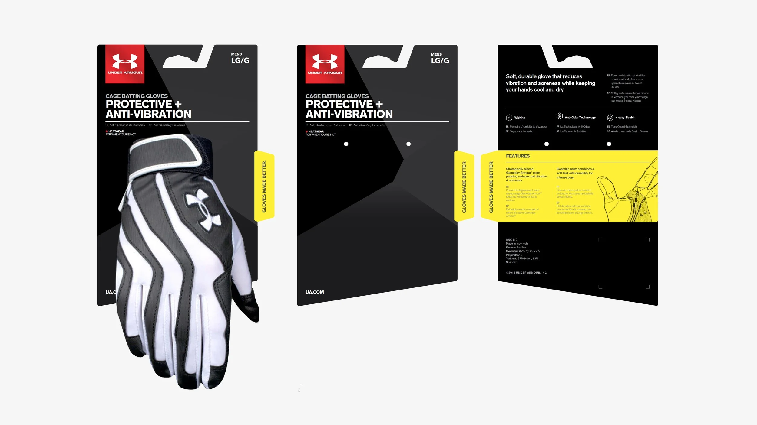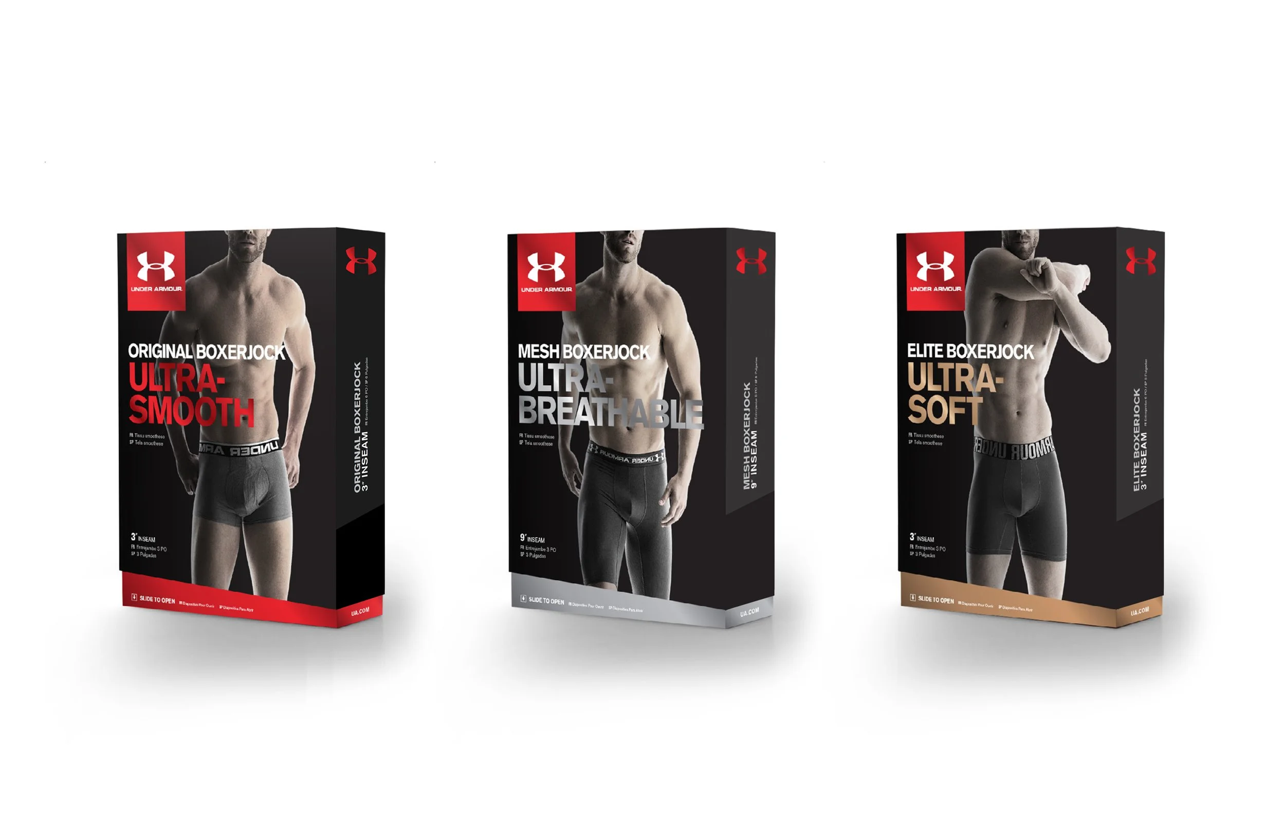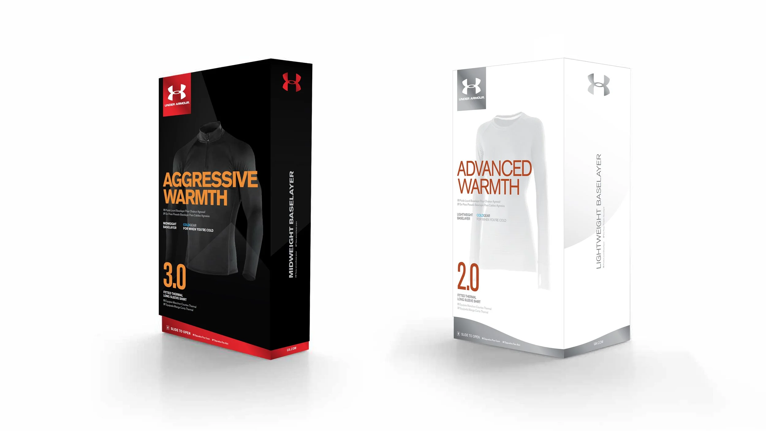 Under Armour's packaging system was fragmented across the organization. Product, trim, and accessory teams independently managed their own packaging segments, resulting in a customer experience that was inconsistent across touchpoints. To address this, packaging was centralized under Global Brand, integrating it into the Consumer Retail Experience team. Through a comprehensive audit of the market and key competitors, the team developed a unified global packaging system that established a consistent design language across all product categories, structures, and accessories.